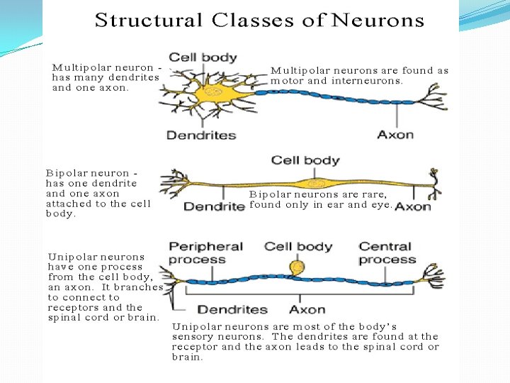 Structural classification of neurons �Classified by their number of extensions from the cell body. �Multipolar- most neurons of brain and spinal cord. Have one axon but several dendrites �Bipolar-One axon and one highly branched dendrite. Only found in the retina of the eye inner ear, and in the olfactory pathway (nose). �Unipolar-single extending process from the cell body. Branches to form one way into the CNS, the second toward the PNS. Always sensory conducting information to the CNS.
