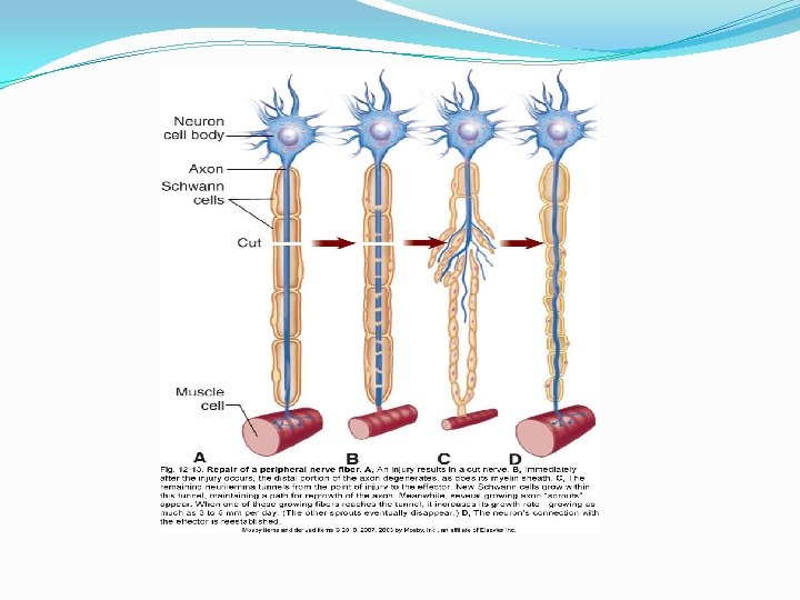 Repair of Nerve Fibers � 1. Injury or cut nerve � 2. Distal portion of axon degenerates � 3. Remaining neurolemma forms a tunnel from effector to nerve body. � 4. Axons sprout on form within the tunnel. � 5. Neruon’s connection is re-established �Can grow from 3 -5 mm per day. �Page 352 Figure 12 -10