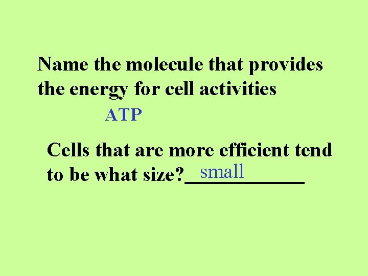 Name the molecule that provides the energy for cell activities ATP Cells that are more efficient tend to be what size? small