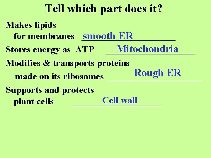 Tell which part does it? Makes lipids for membranes __________ smooth ER Mitochondria Stores energy as ATP __________ Modifies & transports proteins Rough ER made on its ribosomes __________ Supports and protects Cell wall plant cells __________