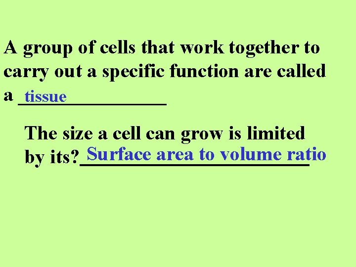 A group of cells that work together to carry out a specific function are called a ________ tissue The size a cell can grow is limited by its? Surface area to volume ratio