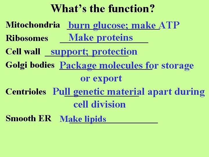 What’s the function? Mitochondria __________ burn glucose; make ATP Make proteins Ribosomes __________ Cell wall _________ support; protection Golgi bodies __________ Package molecules for storage or export Centrioles Pull ________ genetic material apart during cell division Smooth ER Make __________ lipids