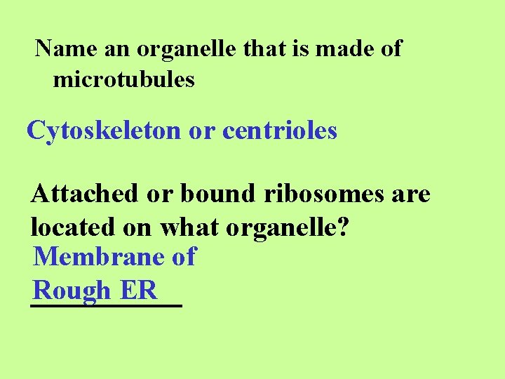 Name an organelle that is made of microtubules Cytoskeleton or centrioles Attached or bound ribosomes are located on what organelle? Membrane of Rough ER