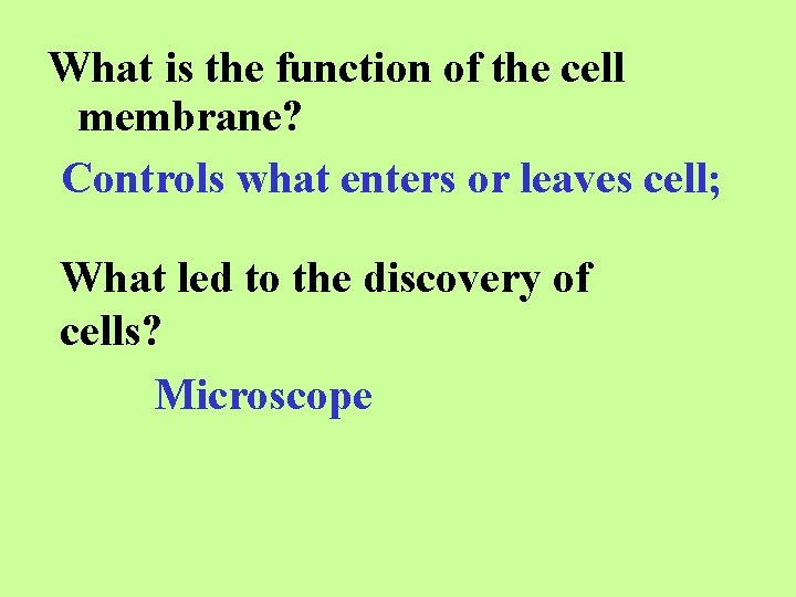 What is the function of the cell membrane? Controls what enters or leaves cell; What led to the discovery of cells? Microscope