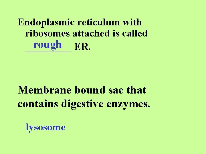 Endoplasmic reticulum with ribosomes attached is called rough ER. _____ Membrane bound sac that contains digestive enzymes. lysosome