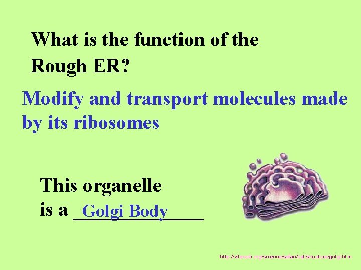 What is the function of the Rough ER? Modify and transport molecules made by its ribosomes This organelle is a _______ Golgi Body http: //vilenski. org/science/safari/cellstructure/golgi. htm