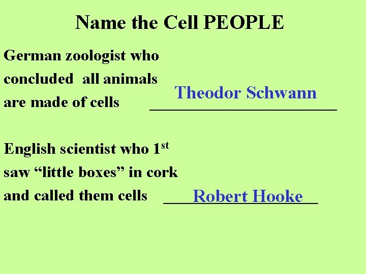 Name the Cell PEOPLE German zoologist who concluded all animals Theodor Schwann are made of cells ____________ English scientist who 1 st saw “little boxes” in cork and called them cells __________ Robert Hooke
