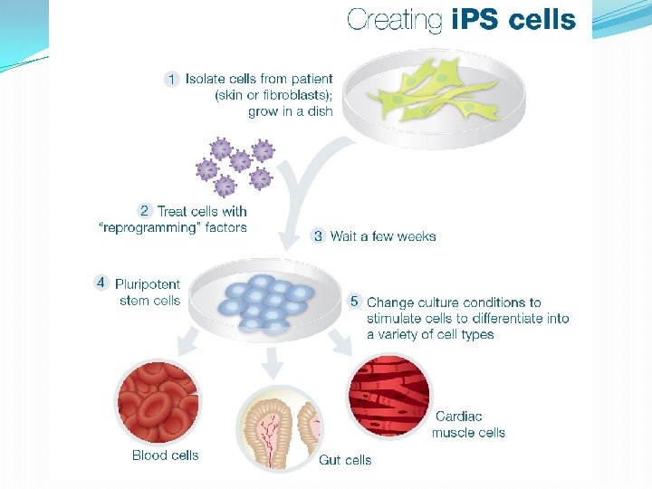 Induced Pluripotent Stem Cells �Induced pluripotent stem (i. PS) cells are created artificially in the lab by "reprogramming" a patient's own cells. �i. PS cells can be made from readily available cells including fat, skin, and fibroblasts (cells that produce connective tissue).