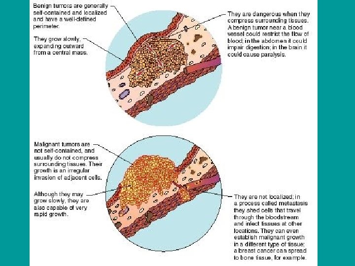 Benign tumor • A growth made up of normal cells that have no signs of cancer. • It’s basically a tumor that doesn't come back and doesn't spread to other parts of the body. • Benign tumors tend to grow more slowly than malignant tumors and are less likely to cause health problems.