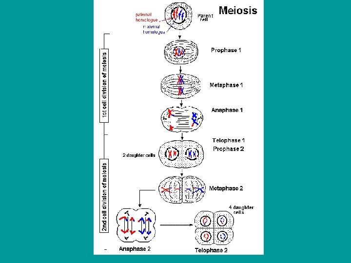 Meiosis • When your sex cells are produced (egg & sperm). • 1 parent cell produces 4 daughter cells. • There are two divisions – Interphase-before meiosis begins, genetic material is duplicated. – FIRST DIVISION: Prophase I, Metaphase I, Anaphase I, Telophase I – SECOND DIVISION: Prophase II, Metaphase II, Anaphase II, Telophase II