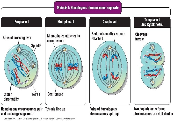 -two rounds of cell division in meiosis -this is how the amount of chromosomes gets cut in half -homologous chromosomes are separated
