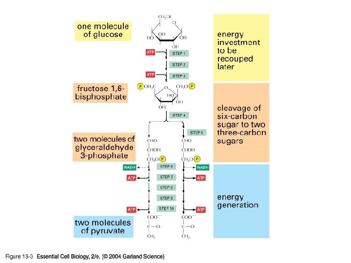 l generating two net molecules of ATP. l Four molecules of ATP per glucose are actually produced, l however, two are consumed as part of the preparatory phase. l The overall reaction can be expressed this way: l Glucose + 2 NAD+ + 2 Pi + 2 ADP → 2 pyruvate + 2 NADH + 2 ATP + 2 H+ + 2 H 2 O + heat