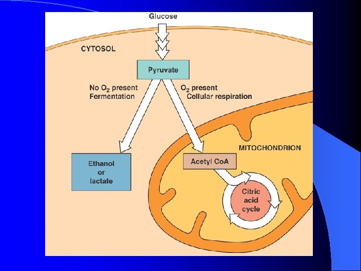 l When oxygen is present, the mitochondria will undergo aerobic respiration which leads to the Krebs cycle. l However, if oxygen is not present, fermentation of the pyruvate molecule will occur. l In the presence of oxygen, when acetyl-Co. A is produced, the molecule then enters the citric acid cycle (Krebs cycle)