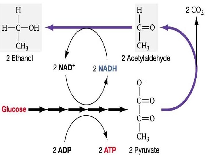 Alcohol Fermentation l Pyruvate is converted to ethanol (ethyl alcohol) in 2 steps. 1. carbon dioxide is released from pyruvate, which is converted to acetaldehyde. 2. acetaldehyde is reduced by NADH to ethanol. • Regenerating a supply of NAD+