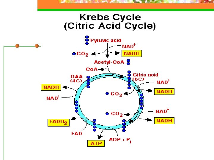 Krebs n n n The cycle transfers electrons to electron carriers (FAD, NAD). There are nine reactions and nine intermediates in the Krebs Cycle, at two places it releases CO 2 and at five places a pair of high energy electrons are accepted by carriers. Products (CO 2, NADH, FADH 2)