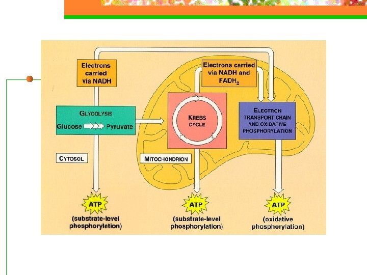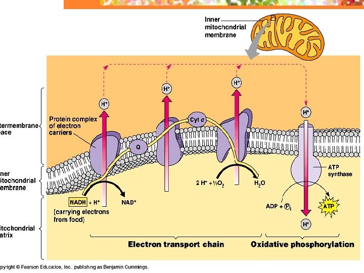 Electron Transport Chain n The electrons from the NADH and FADH 2 are passed to a series of electron transport enzymes in the mitochondrion. At the end of this chain is an enzyme that combines electrons from the chain with H+ and O 2 to form water. This is where O 2 the final electron acceptor in respiration comes from. O 2 is essential from obtaining energy from NADH and FADH 2