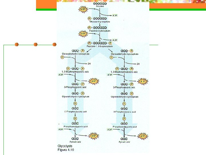 Glycolysis The process of Glycolysis results in 4 molecules of ATP being produced from 4 molecules of ADP. n But because two molecule of ATP are used to start glycolysis and we end up to 4, there is a net gain of 2 molecules of ATP. n