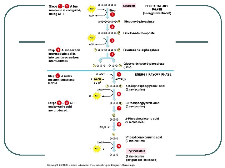Glycolysis 1. Means “splitting of sugar” 2. Occurs in the cytosol of the cell 3. Partially oxidizes glucose (6 C) into two pyruvate (3 C) molecules. 4. Occurs whether or not oxygen is present.