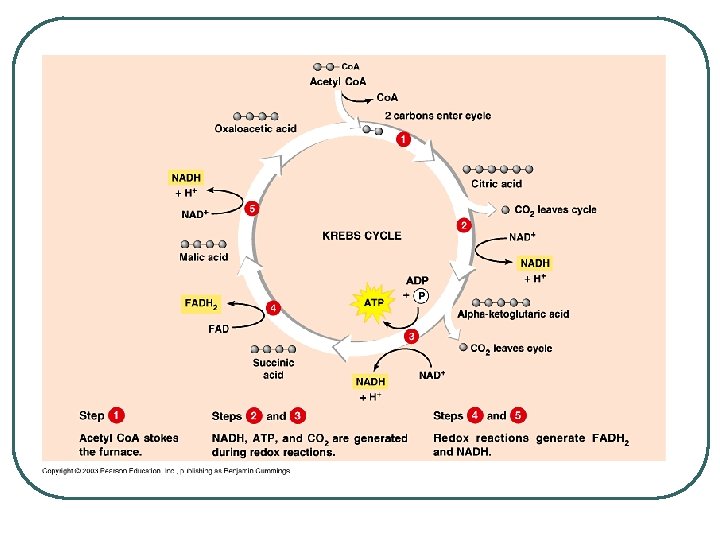 Krebs Cycle l l l Requires Oxygen (Aerobic) Cyclical series of oxidation reactions that give off CO 2 and produce one ATP per cycle Turns twice per glucose molecule Produces two ATP Takes place in matrix of mitochondria