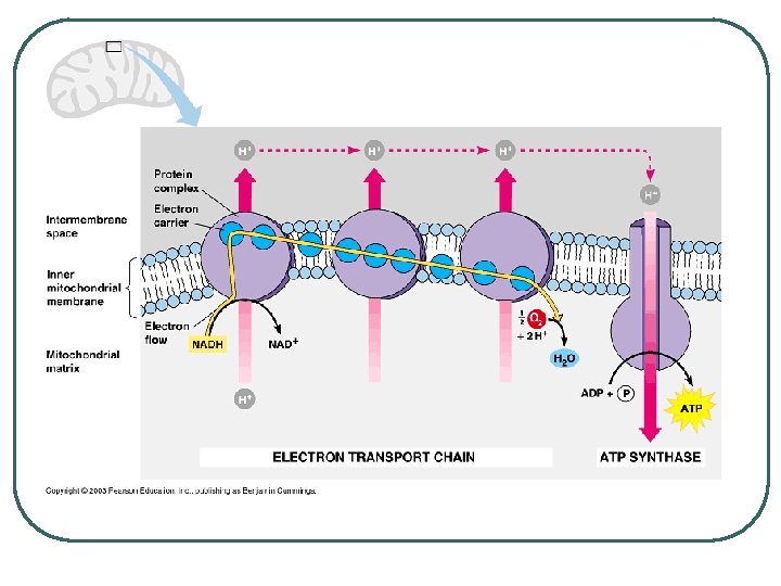 ATP Synthase l A protein in the inner membrane in the mitochondria. l Uses energy of the ion gradient to power ATP synthesis. l For every H+ ion that flows through ATP synthase, one ATP can be formed from ADP