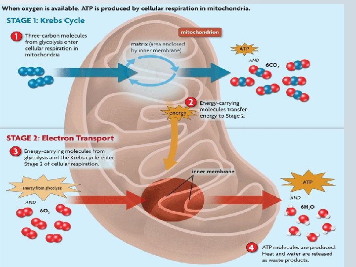 Cellular Respiration – 2 Stages (cont) 2) Electron Transport Chain - made of proteins - uses energy from Krebs cycle and oxygen to make ATP - water and heat are given off as waste products
