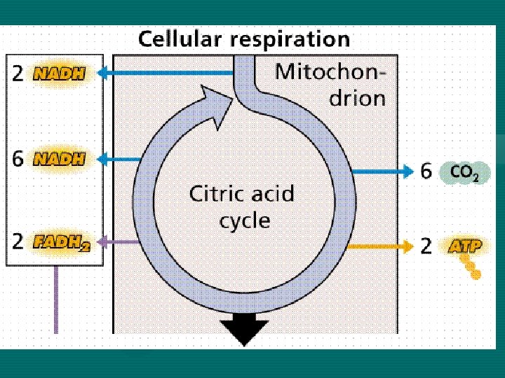 • Acetyl Co. A enters the Krebs Cycle to produce CO 2, NADH, and FADH 2 • The NADH and FADH 2 carry energy to the electron transport chain to make more ATP (this requires oxygen) C 6 H 12 O 6 + 6 O 2 6 CO 2 + 6 H 2 O + 36 ATP