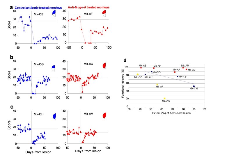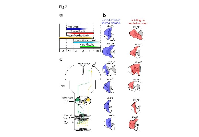 But de nos recherches: Transposer la stratégie “Anti-Nogo “, développée par Prof. Schwab (Uni. Zh) sur le modèle du rat, aux primates Vérification sur modèle animal du singe de lésions restreintes de la moelle épinière ou du cerveau Puis essais cliniques chez les patients Experiments of hemi-section of the cervical cord (C 7) on two groups of monkeys: - No anti “Nogo” treatment (n=6) - Anti “Nogo” treatment (n=7) Injection BDA lesion aimed at the dorsolateral funiculus unilaterally Right M 1 hand area