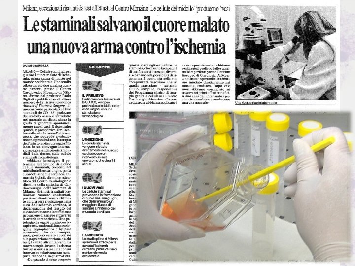 Terapie possibili nel futuro 1) 2) 3) 4) Potenziale cura delle malattie degenerative del sistema nervoso (morbo di Parkinson, morbo di Alzheimer, sclerosi multipla, sclerosi laterale amiotrofica) Ricostruzione del midollo spinale danneggiato da traumi fisici Malattie muscolo-scheletriche Ricostruzione del tessuto cardiaco dopo infarto