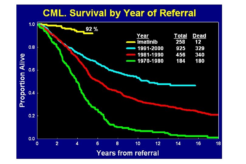 COMPARAISON IM VS IFN-ARA-C : ESSAI IRIS Groupe 1 IFN 5 M UI/M 2/J+ ARA-C 19 Mois RCM RCC FFP 34% 14% 91. 5 87% 76% 97. 5 LMC DIAGNOSTIC (1106 Pts) Groupe 2 Imatinib 400 mg 19 Mois IM : TRAITEMENT DE PREMIERE LIGNE DE LA LMC N Engl J Med. 2003 Mar 13; 348(11): 994 -1004.