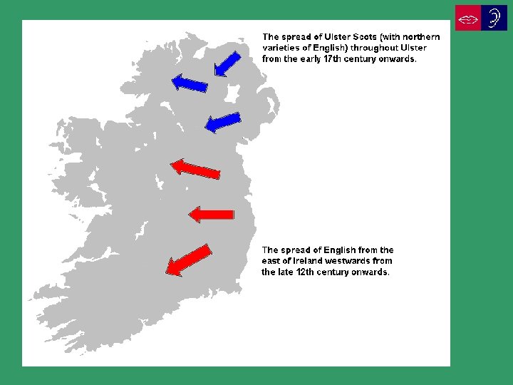 The English language in Ireland In the south of Ireland the development of English was characterised by the major language shift which took place approximately between the early 17 th and late 19 th century. In this period the rural population abandoned their native Irish and increasingly adopted English as their first, and later their only language. During this process many features, above all in pronunciation and grammar, were transferred as part of the new variety of Irish English. Prominent features of the Irish pronunciation of English include the lack of interdental fricatives, a fricative t in open positions and the continuing presence of historical r. In the area of grammar several features are present which can be traced to the language shift or to the retention of earlier English input to Ireland, e. g. They’re after selling their house ‘They have just sold their house’ She has the work done ‘She has now finished the work’ He likes the life in Dublin ‘He likes life in Dublin’ Where are ye going? ‘Where are you [more than one person] going? ’ Some of these features are only found in vernacular Irish English, e. g. He does be at home in the morning ‘He is always at home in the morning’, What are youse up to? ‘What are you [more than one person] doing? ’, They didn’t cause no trouble ‘They didn’t cause any trouble’.