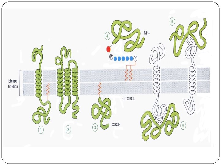 b) Proteínas de Membrana: Integrales o Intrínsecas: Son proteínas que están insertadas en la membrana, presentan dominios apolares que se unen con las colas de los fosfolípidosy dominios polares que muchas veces sobresalen de la bicapa fosfolípidica. Estas proteínas tienen orientación asimétrica, así el extremo aminoterminal (positivo) está en la monocapa externa y el extremo carboxilo terminal (negativo) está en la monocapa interna; estas funciones como canales iónicas o transportadores, etc. Periféricas o extrínsecas. Son proteínas que están en uno de los lados de la membrana, se anclan a una proteína integral o al fosfatidilinositol y funcionan como receptores o enzimas.