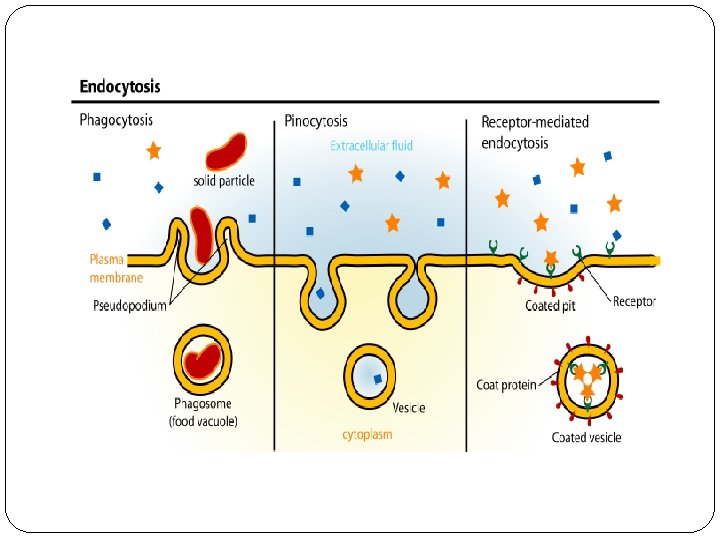 TRANSPORTE DE MACROMOLÉCULAS O PARTÍCULAS: Las macromoléculas o partículas grandes se introducen o expulsan de la célula por dos mecanismos: Exocitosis: Es la excreción de macromoléculas como la insulina a tráves de la fusión de vesículas con la membrana celular. Endocitosis: Es la ingestión de macromoléculas con la formación en el interior de la célula de vesículas procedentes de la membrana plasmática. Existen diferentes tipos de endocitosis como: Pinocitosis. Fagocitosis.