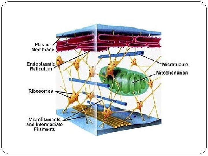 MATRIX CITOPLASMATICA Esta constituida por el coloide celular y el citoesqueleto. El coloide es viscoso, porque tiene un gran número de moléculas grandes y pequeñas. Las moléculas más pequeñas, como las sales, están en disolución acuosa. Las moléculas grandes , como las proteínas, están dispersas en el líquido. Las proteínas de la matriz poseen un alto grado de asociación, lo que permite la formación de filamentos muy delgados y túbulos en todo el citoplasma, esto constituye el esqueleto celular o citoesqueleto