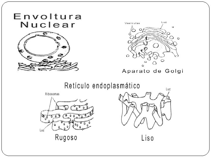 SISTEMA DE ENDOMEMBRANAS: Esta formada por conductos y cisternas delimitadas por membranas e interconectadas. Este sistema tiene como componentes al retículo endoplasmático, aparato de Golgi y carioteca -CARIOTECA: Doble membrana que encierra una cavidad, la cisterna perinuclear, en directa continuidad con la luz del REG, del cual se considera una dependencia. Al igual que éste, presenta ribosomas sobre la cara citosólica. Durante la división celular se desorganiza y se fragmenta en cisternas que se incorporan al REG. Al finalizar la división, la envoltura nuclear se reconstituye a partir de aquél.