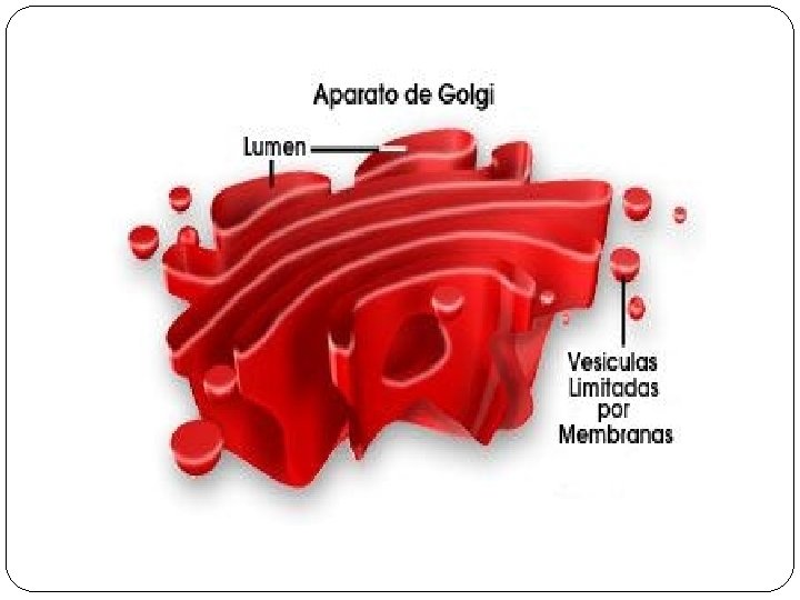 COMPLEJO O APARATO DE GOLGI Descubierto Camilo Golgi en 1898. Es una estructura única situada entre el núcleo y el polo secretor de las células (células mucosas, tiroides). Algunas células son múltiples como los hepatocitos. Está formado por un conjunto de sacos aplanados o cisternas y de vesículas llenas de fluídos. Los sacos se hallan apilados y sus extremos dilatados. Las cisternas de Golgi son de 5 a 8 cisternas por cada fila ó (más de 30). El retículo endoplasmático y el aparato de Golgi forman en el citoplasma una red intercomunicada de tubos.