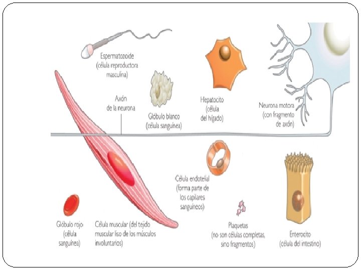 FORMAS DE CÉLULA: Las células varían notablemente en cuanto a su forma, la que de una manera general, puede producirse a dos tipos: CÉLULA DE FORMA VARIABLE O REGULAR. Por ejemplo, los leucocitos en la sangre son esféricos y en los tejidos toman diversas formas. CÉLULAS DE FORMA ESTABLE, REGULAR O TÍPICA. - Son de las siguientes clases: a) Isodiametrica. - son las que tienen sus tres dimensiones iguales casi iguales. Pueden ser: - Esféricas, como óvulos y los cocos (bacterias) - Ovoides, como las levaduras - Cúbicas, como en el folículo tiroideo. b) Aplanadas. - sus dimensiones son mayores que su grosor. Generalmente forman tejidos de revestimiento, como las células epitelialesc) Alargadas. -en las cuales un eje es mayor que los otros dos. Estas células forman parte de ciertas mucosas que tapizan el tubo digestivo; otro ejemplo tenemos en las fibras musculares. d) Estrelladas. - como las neuronas, dotados de varios apéndices o prolongaciones que le dan un aspecto estrellado.