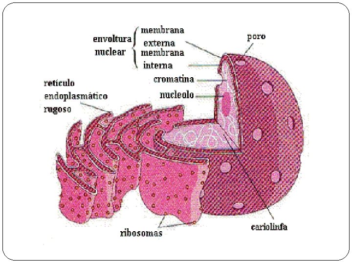 1. -La carioteca Es un sistema de doble membrana (MNE+MNI), es discontinuo porque está atravesada poros , a través de los cuales el interior del núcleo se comunica con el citosol . Las dos membranas que componen la envoltura nuclear (carioteca) se unen a nivel de los poros , los cuales se hallan distribuidos más o menos por toda la superficie de la envoltura. - La membrana externa de la envoltura nuclear se continua con la membrana del retículo endoplasmático, comunmente su cara citosólica aparece asociada a un gran número de ribosomas. - La membrana nuclear interna se halla sostenida por la lámina nuclear, que es un delgado enrejado de filamento intermedios dispuestos en las más variadas direcciones, esta lámina nuclear establece la forma de la envoltura nuclear.
