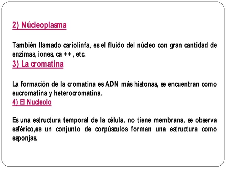 NÚCLEO Es la parte más importante de la célula, la presencia del núcleo es una de las características que distingue a las células eucariontes, es el organelo más importante de estas células. El núcleo ocupa al rededor del 10% del volumen total de la célula y en el se halla continado el ADN (excepto el mitocondrial). COMPONENTES 1. Carioteca 2. Núcleoplasma 3. Cromatima 4. Nucléolo