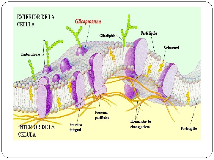 PROPIEDADES GENERALES DE LA MEMBRANA: - La membrana es fluida, pues las proteínas se hallan hidratadas y pueden movilizarse lateralmente. La fluidez está determinada por la presencia de los ácidos grasos insaturados y los esteroides. - La cara externa presenta glúcidos asociados a lípidos y proteínas (glucolípidos y glucoproteínas), a diferencia de la cara interna que carece de glúcidos. La disposición de las proteínas es diferentes hacia ambas caras, por eso se dice que la membrana es asimétrica, y adquiere la configuración de un mosaico - La membrana es semipermeable, es decir presenta permeabilidad selectiva. Controla el ingreso y salida de moléculas