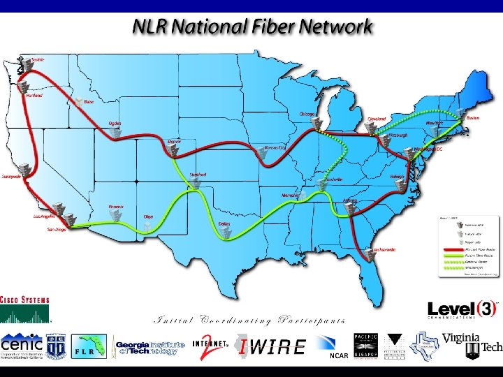 Distinguishing features - I n n n NLR, Inc. has been established as a non-profit organization (May 2003, 501(c)(3) tax-exempt status being sought) Partnership with industry (CISCO is a major partner/contributor with special interest in promoting network research) Largest higher-ed owned/managed optical networking & research facility in the world – ~10, 000 route-miles of dark fiber (Level 3) – Four 10 -Gbps ’s provisioned at outset n First & foremost, an experimental platform for research – – Optical, switching & network layers Research committee (with 2 board seats) Experimental support center 50% of capacity available for network research