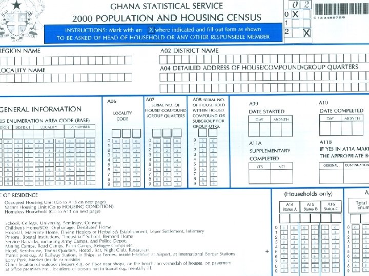Geographical Coding System n n n The 2000 Ghana census was conducted at the household level. A 15 -digit reference code was used to uniquely identify each household. The hierarchical coding system used was as follows: