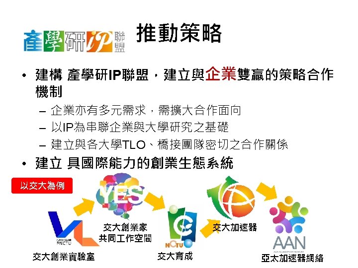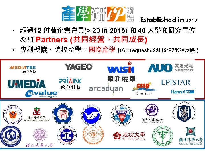 Basic IPR Platform and Operation Pilot Run Accomplished 基本模式 ,建立互信 Mutual Trust 大學(s) Universities 產業 A $$ Industry A IP Alliance IP 聯盟 Univ Patents 大學專利(s) IP 防禦訴訟 IP Defense and Products!! 專利戰略中心 IP Strategy Center (IP SC) $$ 產業 B 專利 Industry B Patents 產業 C 公平、公開、公正、有償、台灣優先之專利平台