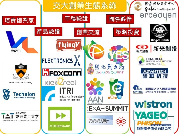 NCTU Self-Operated Accelerator (加速器) Eco-System Final Venture Process NCTU+New Taipei+National 400 25 新竹 新安 共同 作空間 交大創業實驗室 亞太加速器網絡 15 NCTU 交大加速器 80 新北市 台北橋 共同 作空間 NCTU+New Taipei 柏林 – 台北 百人 創業家網絡