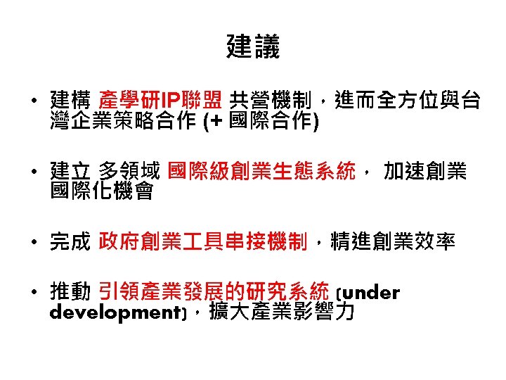 建立以企業為主之專利布局策 略 Industry based patent strategy • 建立與企業互信機制 (mutual trust) – Willingness to help industries (but requests for reasonable payback) • 進行策略研究開發 (strategy research) – Target research development @ national level – Experts system for future products and new industries • 推動IP產業暨新創產業 (creating IP and new industries) – Talents and Technology readiness for global competition 建立共同經營之平台