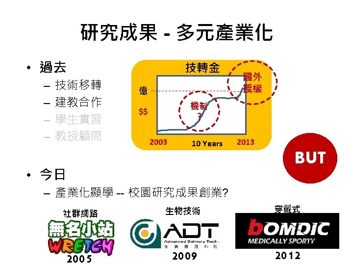 Intel Challenge Champions • 2013: Golface : The Best Golf Experience http: //www. golface. com. tw/golface/ – NT 9 millions angel fund raised, 2013 • 2014, b. OMDIC: Go. More http: //www. bomdic. com/ 交大 加速器 團隊 – NT 20 millions angel fund raised, 2014