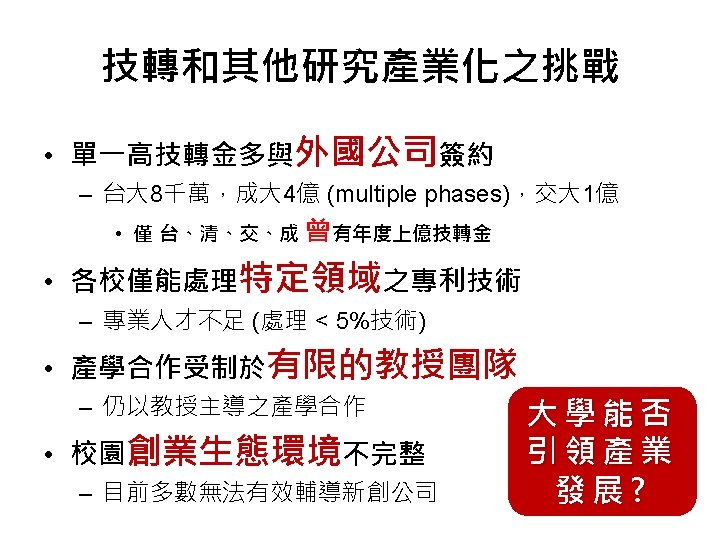 Commercialized IPR Platform and Operation IP Industry 商業模式、IP產業 國家型 研究 Strategy Research 策略研究 大學(s) Universities IP Offence IP 聯盟 IP 攻擊訴訟 IP 開發策略 IP 產業 IP Industry National Research Institutes 研 究 專 利 $$ Univ Patent 大學專利(s) 策 略 研 究 專利戰略中心 次產業 中心 IP SC Platform Partners 企業專利(s) Industry Patent $$ 產業 A 專利 NPE Industry A $$ 策略 專利 Patent Strategy 產業 B 專利 NPE Industry B 產業 C Research Direction 研究需求 專利 NPE