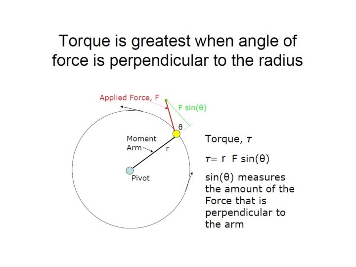 Practice Problem • What is the torque on a bolt applied with a wrench that has a lever arm of 45 cm with a force of 10 N? • Torque = F x r = (10 N)(0. 45 m) = 4. 5 N m