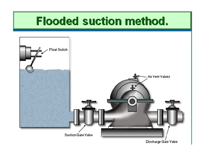 Pump Priming Definition: Filling the pump casing and the suction line with the liquid being pumped. Methods of Priming 1 - If the pump is above the source of supply Øclose the discharge valve and open the suction valve. ØOpen the air vent valves to allow the air in the pump casing to escape. ØWhen water flows from the vents, they can be closed and the pump is then in primed conditions and ready for starting