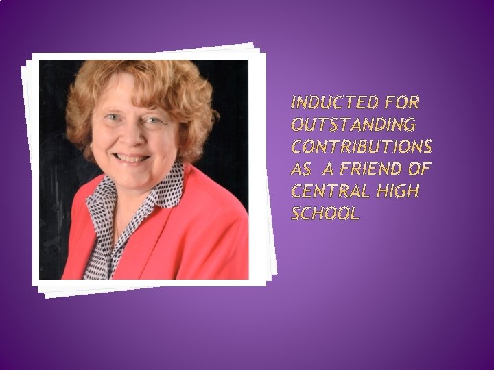 Inducted for Outstanding Contributions as a Friend Connie Vickers is a 1970 graduate of Central. She has also served as a friend of our fine arts programs for many years since her graduation. It takes a great deal of time and a big effort for any of our programs to run successfully. It is often accomplished with the help of those behind the scenes and out of the spotlight who are not always recognized for all they do to make that success possible. That describes the outstanding contributions of Connie Vickers to our school. As a Central student, Connie was very active in school organizations. She was involved in many activities, including Student Council, Future Teachers of America and NHS. There were no female sports at that time or she certainly would have participated in them as well. She often took on leadership roles and served as the Class President for 3 years. She enjoyed music and got involved as an accompanist for the Girls Glee Club under the direction of Carolyn Eggleston. She was a member of the Mixed Chorus and held the office of President. She was an All-State Vocalist her senior year and won a National Coral Award. Of no ones surprise, 3 of her children (Andrew, Philip and Rachel) also won the same award as high school students. After high school, Connie attended the University of Northern Iowa where she was a Vocal major finishing her degree at Clinton Community College as a Registered Nurse. She worked in emergency medicine in Clinton and married Matt in 1972. She continued her