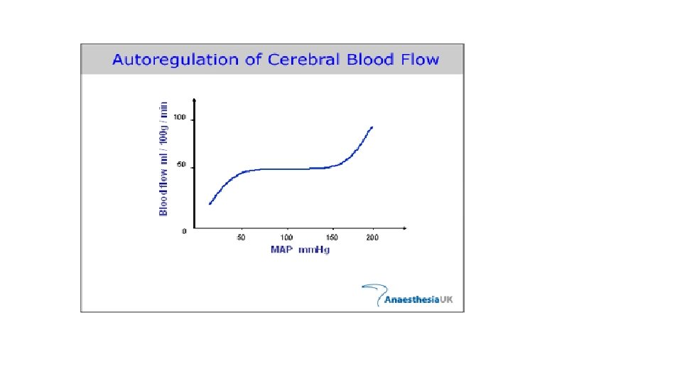 Hypoxia and ischemia • Brain is highly oxygen dependent. • Brain 2% of body weight but receives 15% of cardiac output • 20% of total body oxygen consumption. • Autoregulation of vascular resistance allows stability of cerebral blood flow over a wide range of blood pressures and intracranial pressure. • If blood pressure very low (systolic less than 50)… hypoxia